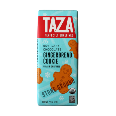 Gingerbread Cookie Amaze Bar combines 60% dark stone ground chocolate with cinnamon, ginger, and a gingerbread cookie crunch.