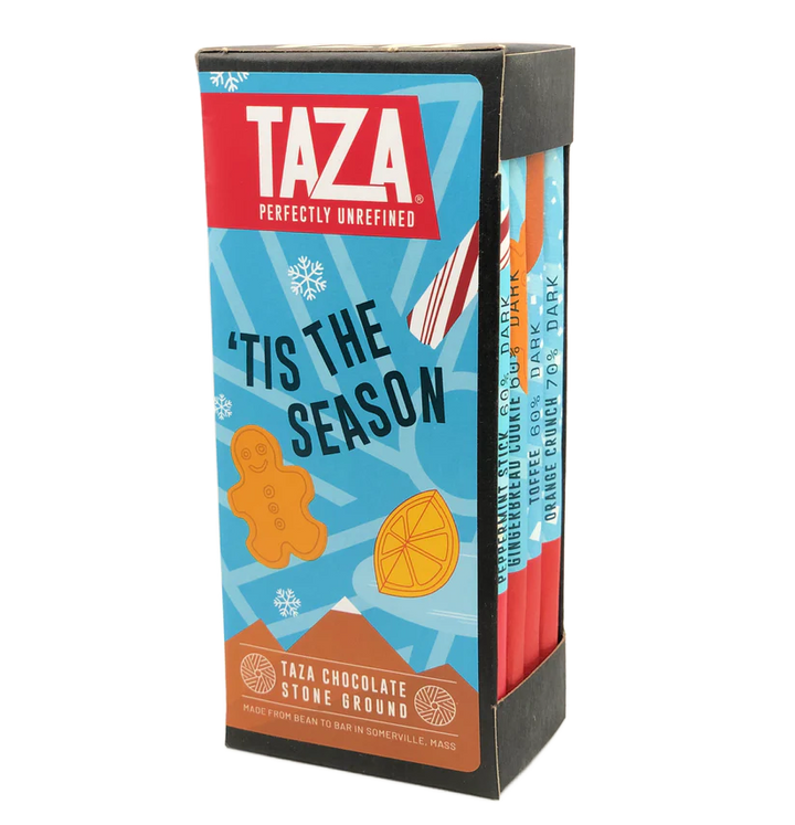 Share the gift of organic, stone ground chocolate this season! Tucked inside this library style gift box are one of each of the Holiday Amaze Bars: Peppermint Stick, Gingerbread Cookie, Orange Crunch and Toffee. These bars capture the true chocolate flavor that comes through when the best Direct Trade cacao is gently stone ground.